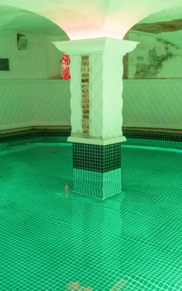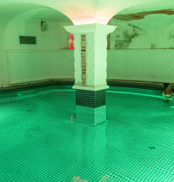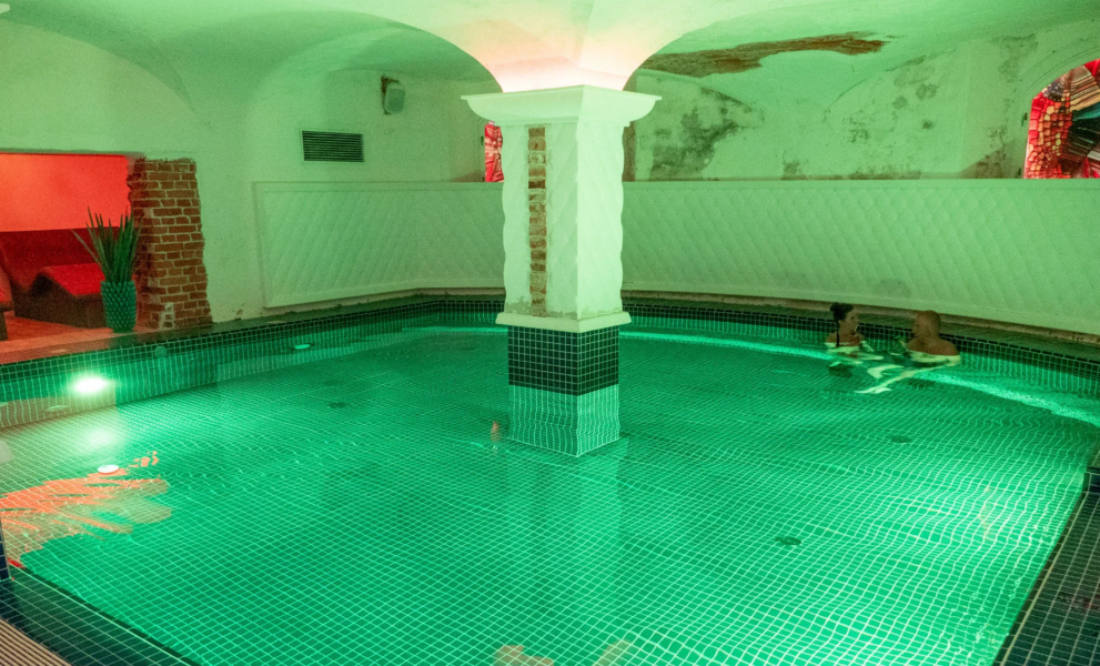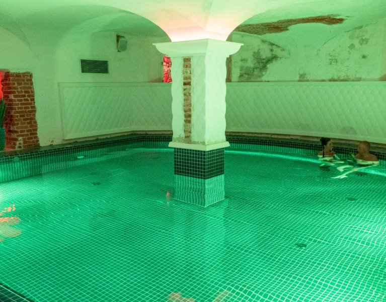 An indoor warm-water pool located in a hall with vaulted ceilings and columns.