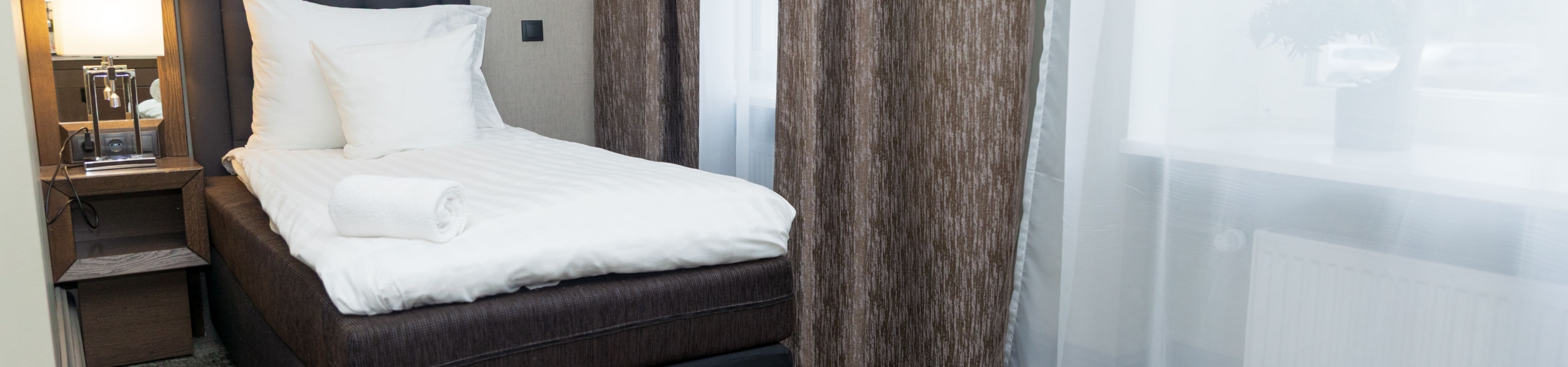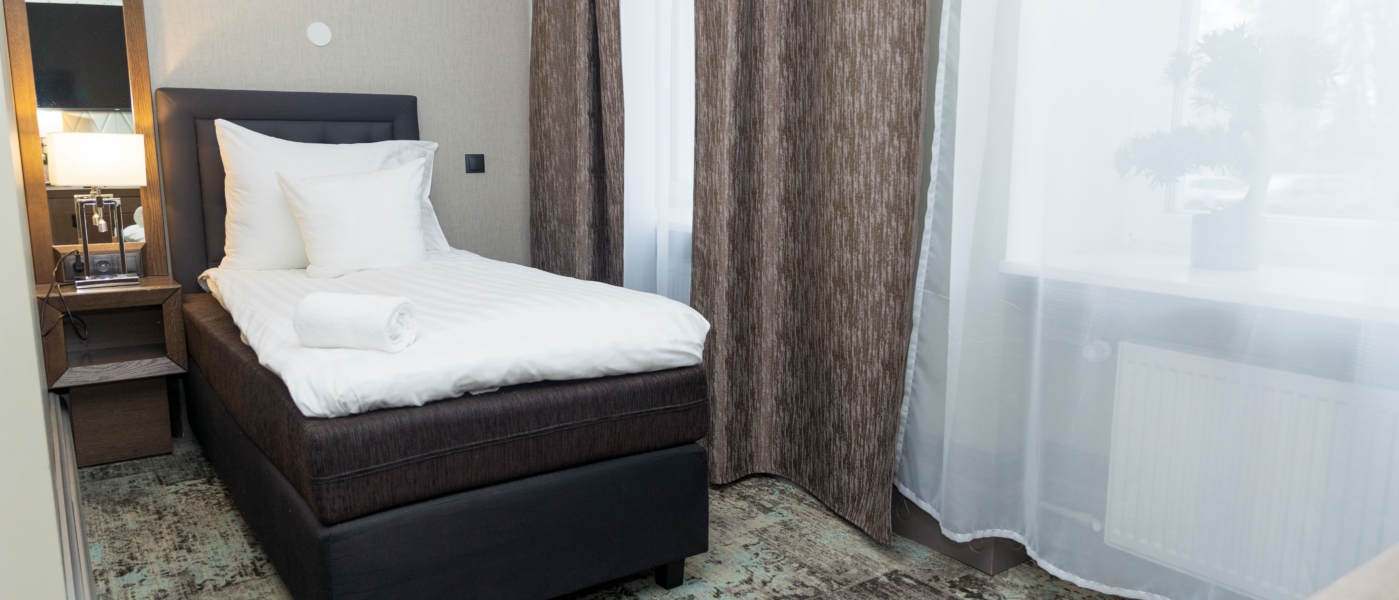 Governor’s House suite with a private garden (not connected to the main building). A 100 m² two-room suite with a kitchen and an elegant veranda. The suite has a retro bathtub and a separate shower room. The restaurant and the spa & sauna centre are located in the castle. The Governor’s House and the castle are not interconnected.