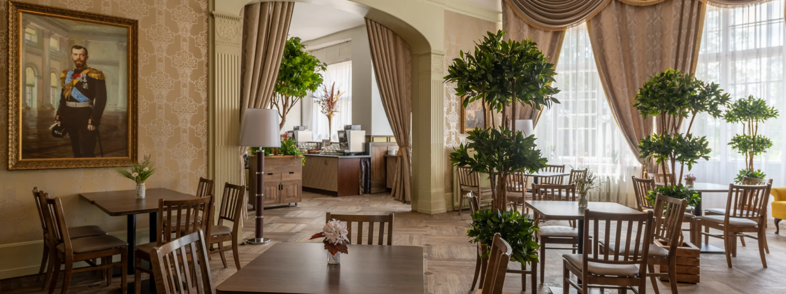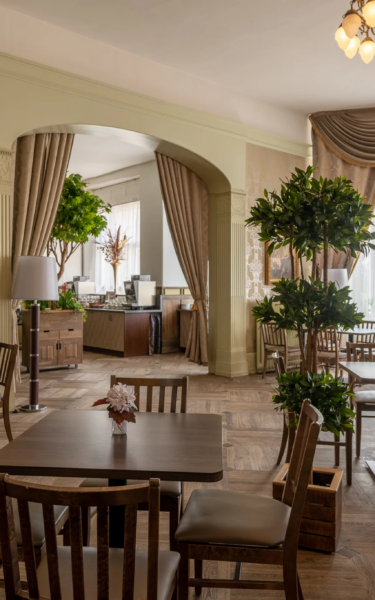 A cosy hall with soft armchairs, Art Nouveau cabinets characteristic of the castle, and a snug fireplace. Perfect for ending a long day thanks to its historical atmosphere and mellow lighting. Treat yourself to a glass of wine or cognac after a memorable dinner and reflect on the day gone by.