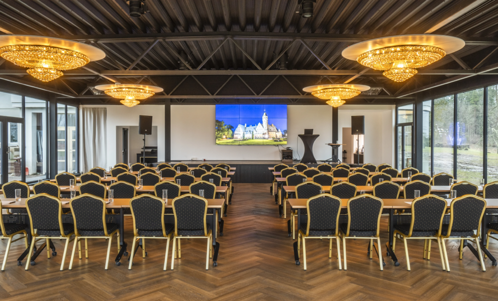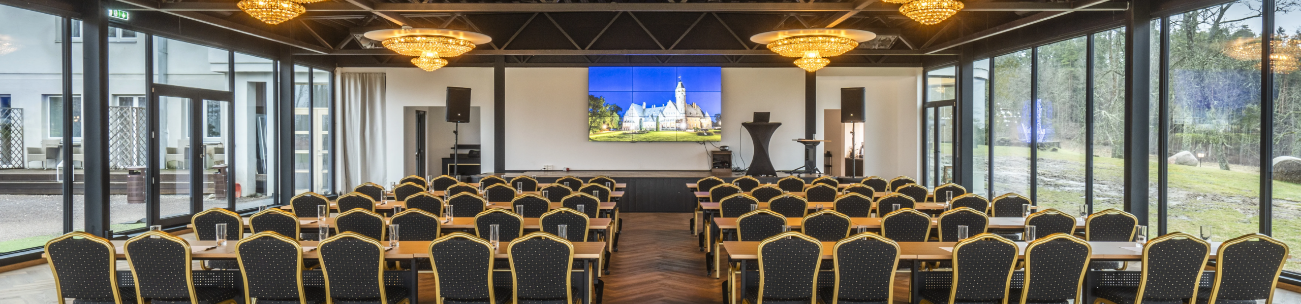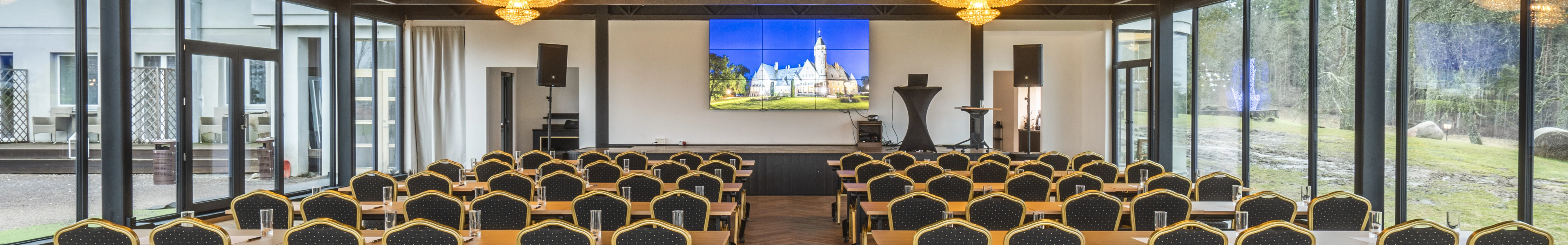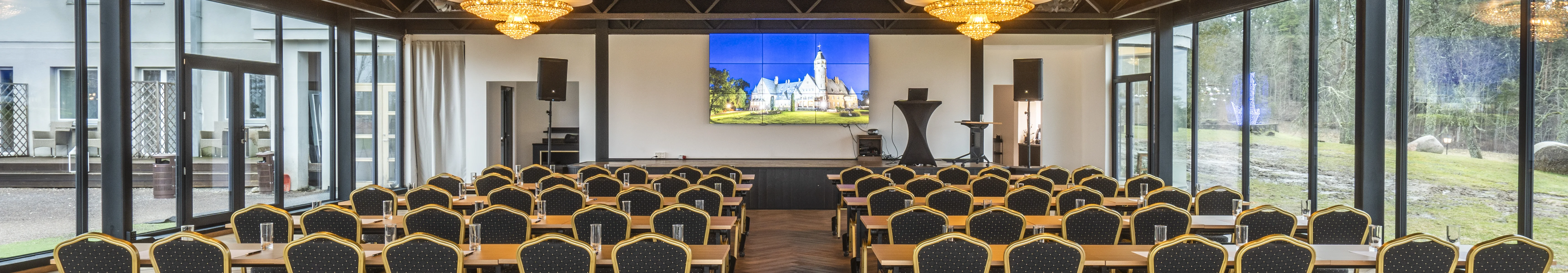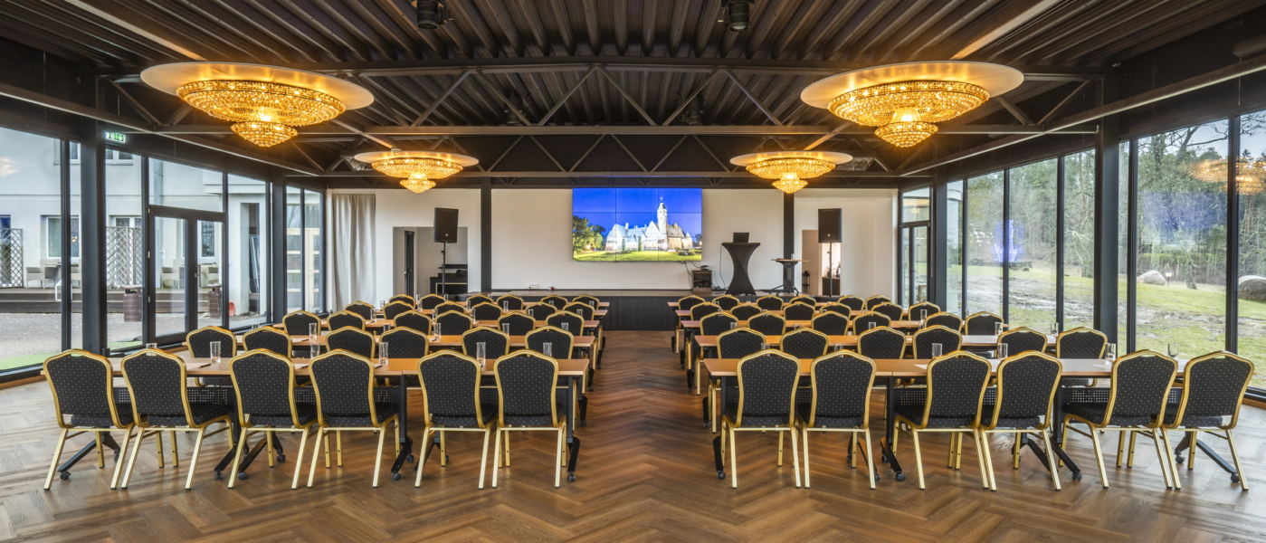 The Crystal Hall is an ideal place for celebrating special events – a hall with magnificent chandeliers that accommodates up to 300 people in theatre style and offers a luxurious and elegant atmosphere with a view of the historic castle and Lake Taagepera.
