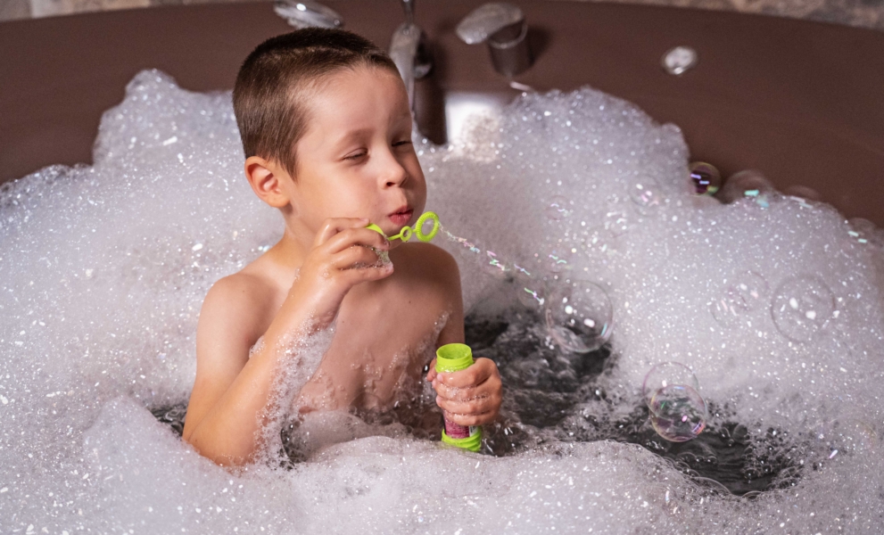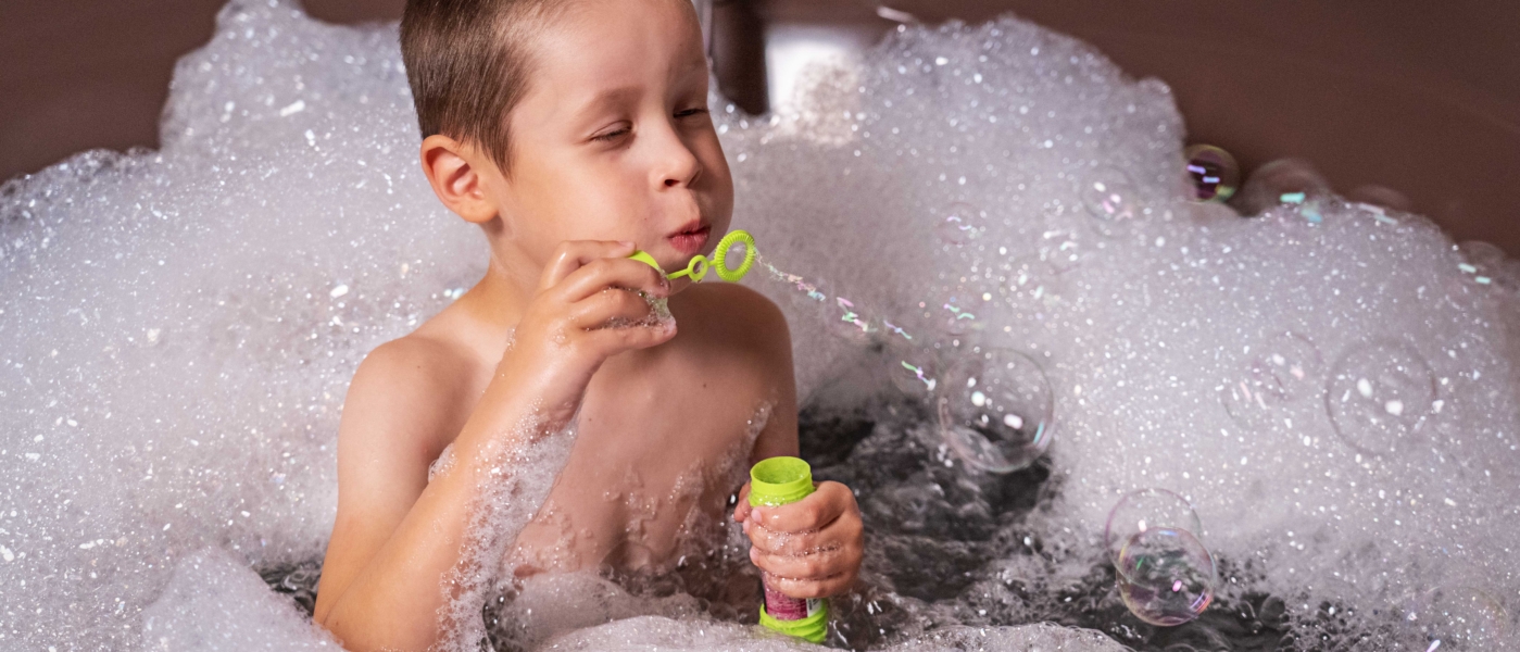 Spanissamme lapsia odottavat rentouttavat ja leikkisät hoidot – esimerkiksi kahden minuutin hetki voikukan hierontabalsamilla tai vaahtoava vihreän omenan kylpy, joka tuo iloa ja parantaa unen laatua.