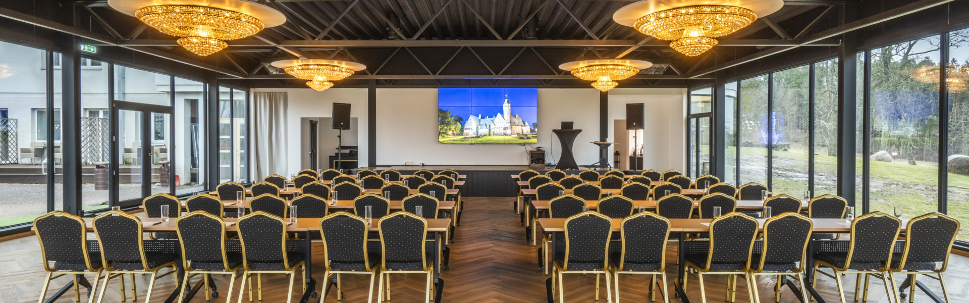 Kristallisali on ihanteellinen paikka erityisten tilaisuuksien juhlistamiseen – upeilla kattokruunuilla varustettu sali, johon mahtuu teatterityylissä jopa 300 henkilöä, ja joka tarjoaa ylellisen ja elegantin tunnelman: näkymän historialliseen linnaan ja Taageperan järvelle.