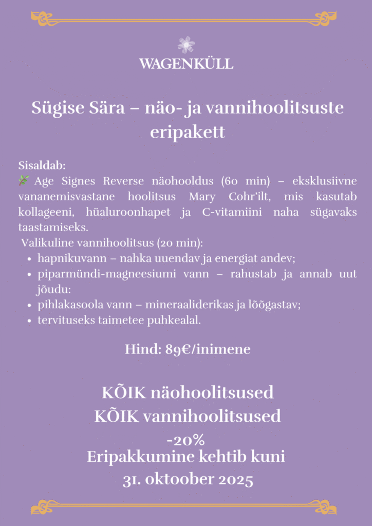 - Juhul kui Sul ei ole võimalik tulla broneeritud hoolitsusele, siis palume sellest meile vähemalt 24 tundi varem teada anda kas e-posti spa@wagenkull.ee või telefoni teel +372 5981 2455. Hoolitsuste eest tasutud ettemaks ei ole tagastatav.